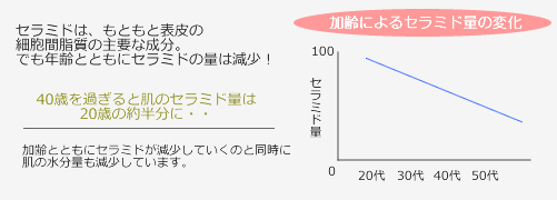40歳を過ぎるとお肌のセラミドは20歳の約半分に減少してしまいます。セラミドが減少するとバリア機能が衰え、