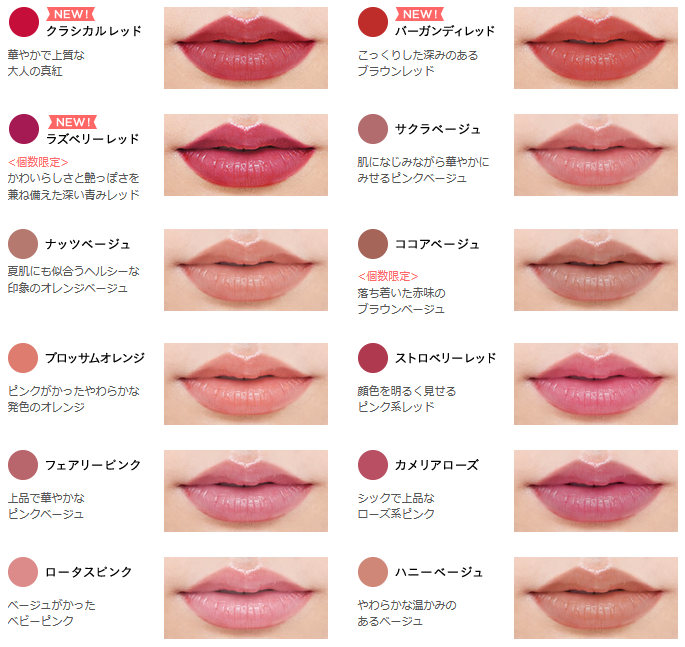 ※クラシカルレッド、バーガンディレッド、ラズベリーレッド、サクラベージュ、ナッツベージュ、ココアベージュ、ブロッサムオレンジ、ストロベリーレッド、フェアリーピンク、ロータスピンク、ハニーベージュはコチニール色素(カルミン)を含み、コチニール色素(カルミン)は食品にも使われる天然色素です。